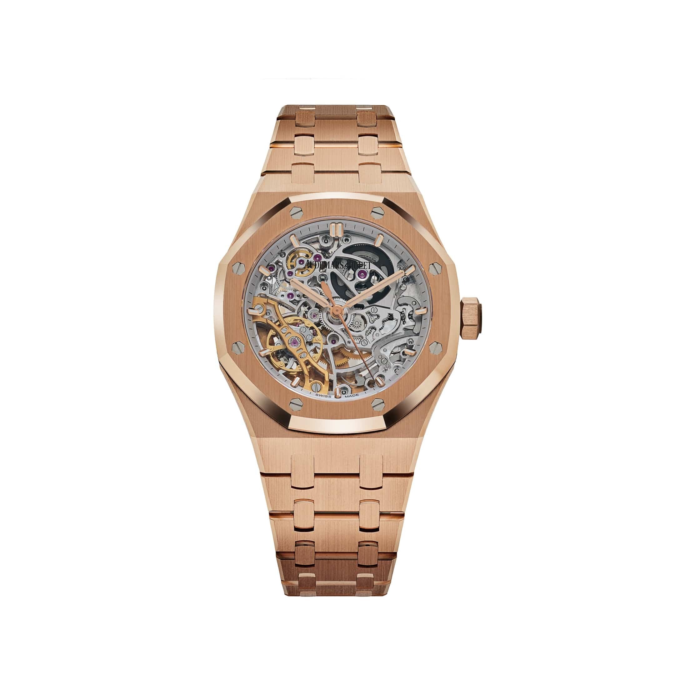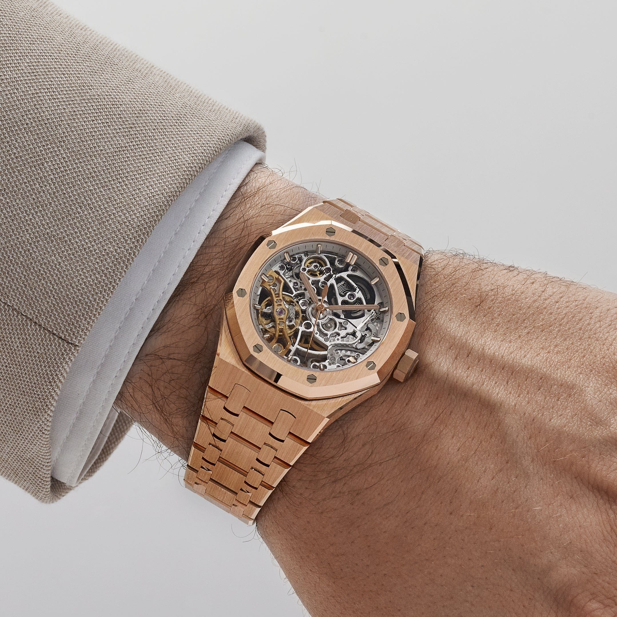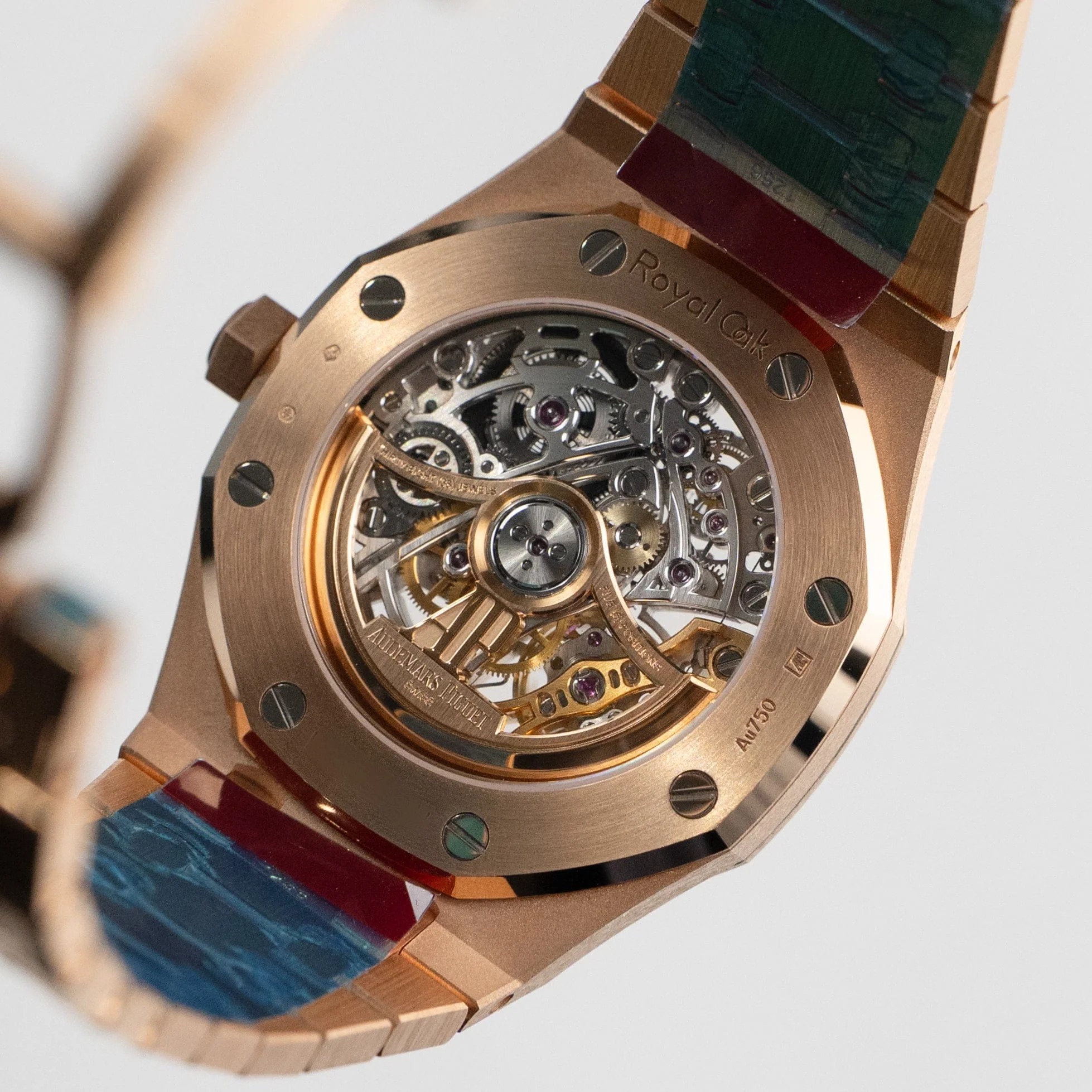 The 37mm case crafted in 18-karat rose gold features the iconic octagonal bezel with eight exposed white gold hexagonal screws, brushed surfaces on bezel top and case band contrasting with polished chamfers, integrated lugs flowing seamlessly into bracelet construction, screw-locked crown, glareproofed sapphire crystal, and transparent sapphire caseback revealing the extensively openworked movement from reverse angle. The openworked rhodium-toned dial reveals the intricate architecture of the self-winding Caliber 3132 movement with visible double balance wheel system oscillating at 9 o’clock position, skeletonized bridges and mainplate finished with circular graining and polished bevels, applied rose gold hour markers with luminescent coating maintaining Royal Oak design vocabulary, rose gold Royal Oak hands with luminescent fill, small seconds subdial integrated into movement structure, all mechanical components visible through strategic openworking creating mesmerizing depth and dimensional complexity. Inside beats the automatic Caliber 3132 featuring the patented double balance wheel mechanism with two balance wheels and two hairsprings mounted coaxially for enhanced precision, 38 jewels, frequency of 21,600 vibrations per hour, approximately 45 hours of power reserve, movement components constructed with extensive hand-finishing including circular graining, perlage, polished bevels. Rose gold integrated Royal Oak bracelet with alternating brushed and polished surfaces secures with AP folding clasp.