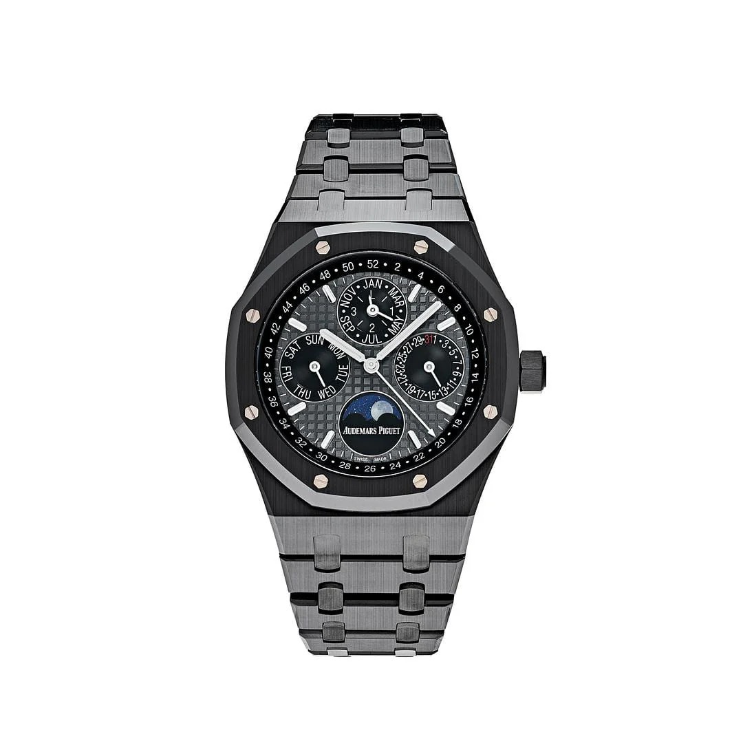 The Royal Oak Perpetual Calendar 26579CE.OO.1225CE.01 in a 41mm black ceramic case is a stunning blend of sophistication and functionality. Its iconic octagonal bezel adds to its allure, setting it apart as a symbol of luxury.