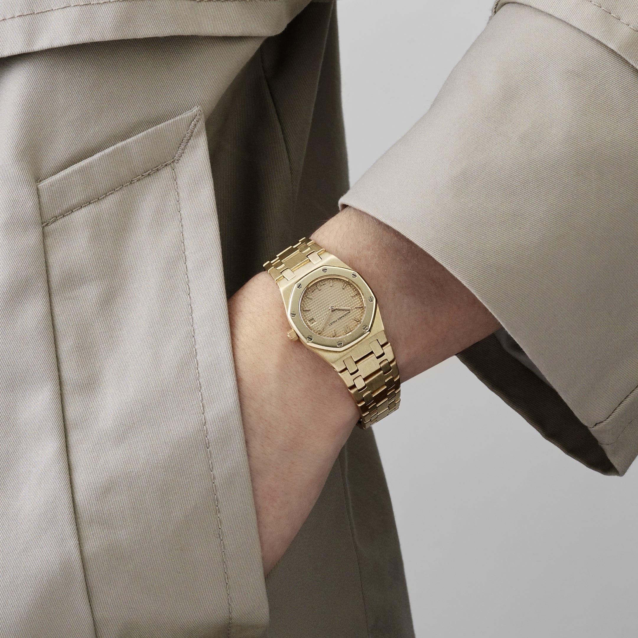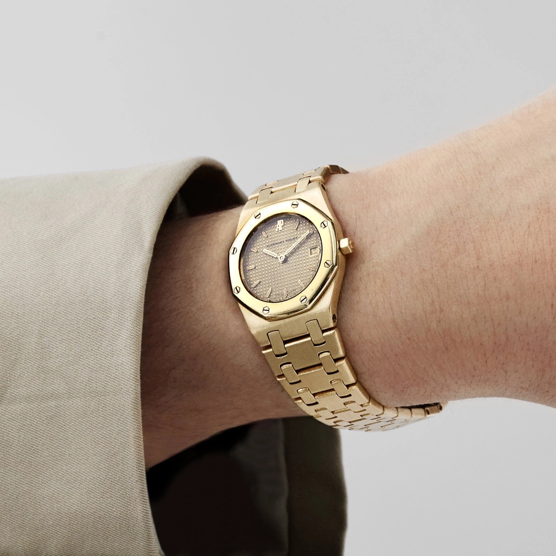 The petite 25mm case crafted entirely in 18k yellow gold features signature octagonal bezel with eight exposed hexagonal screws in white gold, brushed and polished surfaces combining matte and reflective finishes, integrated construction where case flows seamlessly into bracelet, sapphire crystal. Champagne-toned dial features Grande Tapisserie guillochĆ© pattern comprised of small square motifs creating textured surface, applied baton hour markers in yellow gold, slim baton hands in yellow gold, minimalist layout emphasizing clean design aesthetic. Precision quartz movement ensures accurate timekeeping with effortless functionality requiring minimal maintenance. Fully integrated 18k yellow gold bracelet designed as single piece with case showcasing AP’s signature construction philosophy, alternating brushed center links and polished outer links creating visual contrast, AP folding clasp in yellow gold.