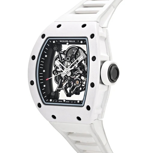 The Richard Mille RM 055 Bubba Watson is a visually striking and technically impressive timepiece, originally created in collaboration with professional golfer Bubba Watson. Its 49.90mm x 42.70mm tonneau-shaped case features a bold construction of ATZ white ceramic for the bezel and caseback, known for its extreme scratch resistance and brilliant whiteness. The mid-case is crafted from grade 5 titanium, offering both strength and lightweight comfort, resulting in a design that balances performance with unmistakable presence on the wrist.
