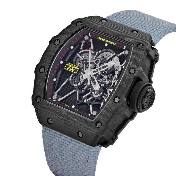 The Richard Mille RM 35-01 Rafael Nadal features a Black Carbon TPT case measuring 49.94mm x 42mm, embodying the brand’s signature blend of cutting-edge materials and featherweight construction.