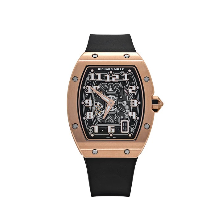 The Richard Mille RM 67-01 Extra Flat Rose Gold is a limited edition timepiece, featuring a 38.7 x 47.52 mm rose gold tonneau-shaped case. Its skeletonized dial, paired with a deep red rubber strap, enhances its distinctive design. As Richard Mille’s flattest watch to date, its rarity and unique aesthetic make it a coveted piece among collectors.