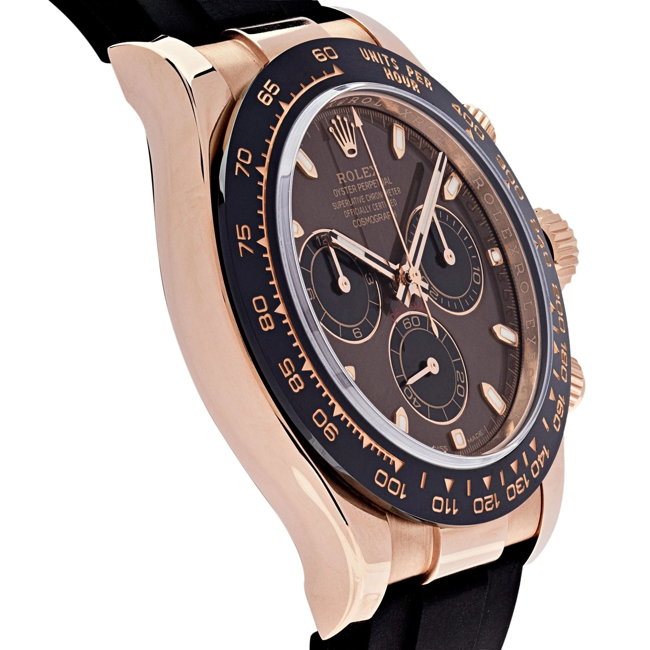 The black Cerachrom bezel, engraved with a tachymeter scale, enhances the watch’s bold aesthetic and underscores its motorsport heritage. The bezel’s scratch-resistant and fade-proof properties ensure enduring durability. The chocolate brown dial serves as the centerpiece, featuring contrasting black subdials with Everose gold accents, which add depth and character. Luminous hour markers and hands ensure exceptional legibility, even in low-light conditions, making it as functional as it is beautiful.