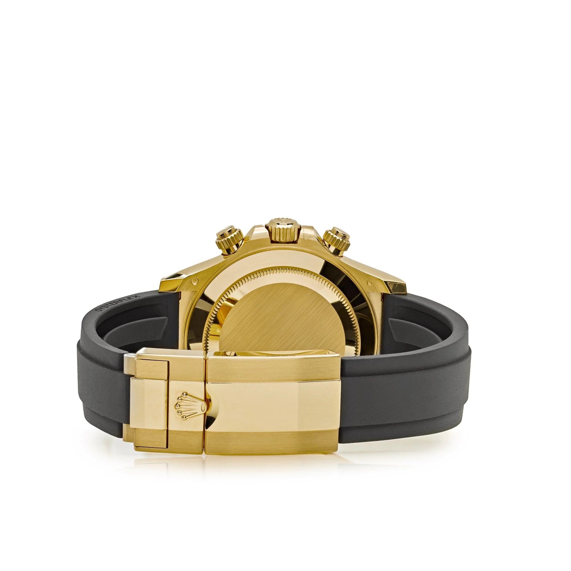 The black lacquered dial, adorned with sapphire-set hour markers, creates a dramatic contrast. The subdials, ringed in yellow gold, maintain the Daytona’s chronograph heritage, offering precision timing for motorsport enthusiasts.